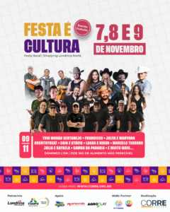 A Festa é Cultura chega pela primeira vez à região norte de Londrina e transforma, nos dias 7, 8 e 9 de novembro, o estacionamento do Londrina Norte Shopping em um polo de circulação da cultura regional. Com entrada gratuita e mais de 20 atrações, o evento prioriza artistas locais e iniciativas culturais comunitárias, consolidando-se como uma das principais plataformas de valorização da produção independente no município.